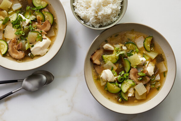 1. In a large Dutch oven, combine kelp, radish, dried shiitakes and 5 cups of water, and bring to a simmer over high heat. Cover, reduce heat to medium and simmer for 5 minutes. Transfer kelp and mushrooms to a cutting board, and transfer broth with radish pieces to a bowl and reserve. Chop kelp into 1-inch pieces, very thinly slice the mushrooms and add both to reserved broth.