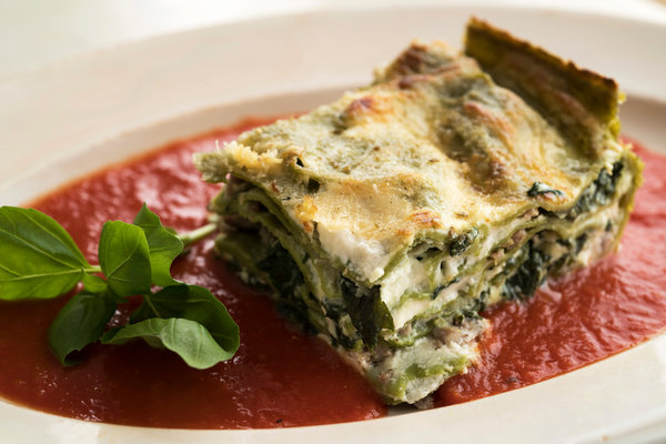 13. Just before serving, reheat tomato sauce. To serve, cut lasagna into 3- or 4-inch squares. With a spatula, transfer each serving to individual plates. Spoon about ½ cup tomato sauce around each serving. Garnish with basil leaves.