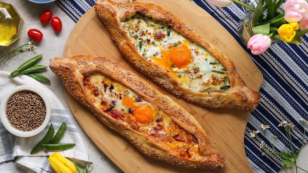 These khachapuri, or Georgian cheese breads, are made with a blend of ricotta, feta, and mozzarella cheeses and fresh vegetables wrapped in store-bought pizza dough and topped with over-easy eggs for a simple, yet satisfying dish. Try the asparagus, pea, fresh dill, and coriander version, or the roasted tomato-garlic version with shallots and ajika, a smoky blend of spices with a little kick of heat!