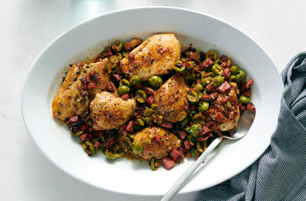 - Reduce the heat to medium. Add the salami and a few generous grinds of pepper. Cook, stirring, until browned and crisp, 3 to 5 minutes. Add the shallot and cook until softened, 1 to 2 minutes. Add the water, increase heat to a simmer and cook, scraping up browned bits, until reduced by half, 3 to 5 minutes. Add the olives, chicken and any juices from the plate. Simmer until the chicken is warmed through, 1 to 2 minutes.