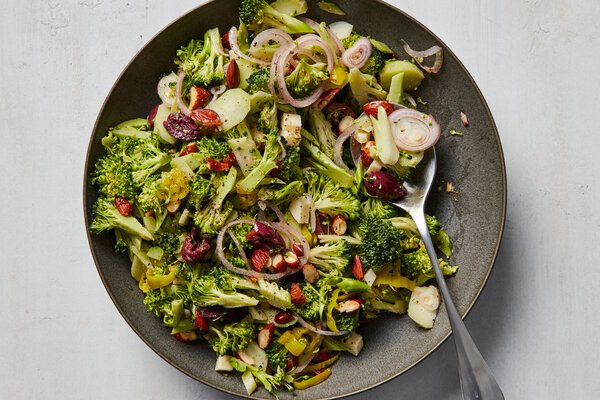 3. Season the broccoli generously with salt and pepper, then add the almonds, pickled peppers, olives, oil, vinegar and provolone. Toss vigorously with a spoon until everything is combined and the broccoli is shiny with oil.