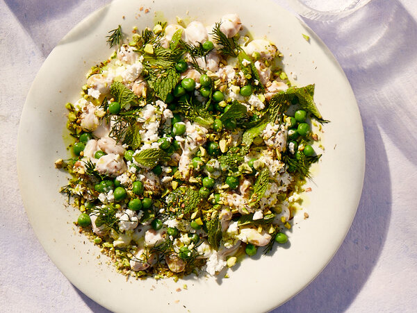 - In a separate bowl, mix together the peas, dill, mint and remaining 1½ teaspoons oil with ⅛ teaspoon salt and a good grind of pepper.