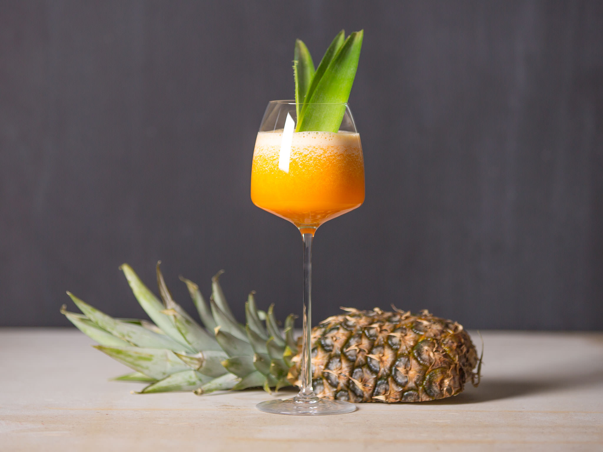 Add pineapple, ginger, carrot juice, orange juice, ice cubes, and honey to blender. Add lime juice.