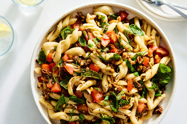 - When ready to eat, taste the pasta salad. If flavors are muted, add salt and lemon juice or red wine vinegar. If it’s too sweet, add black pepper and lemon juice or red wine vinegar. Stir in the greens and eat.