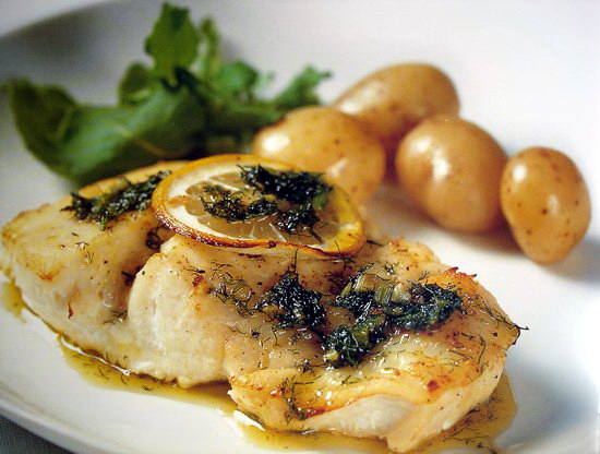 4. Transfer the cooked fish to plates and pour the cooking juices into the herb butter. Heat gently for few seconds, then pour the herb butter over the fish. Serve immediately.