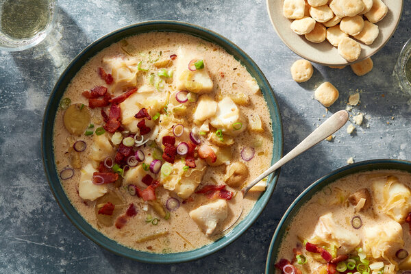 - Divide chowder in bowls and garnish with the crispy bacon and remaining scallions. Serve with crusty bread or oyster crackers.