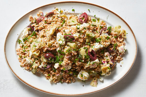 - Transfer the farro to a medium mixing bowl. Add the vinegar, oil and ½ teaspoon salt, and stir to combine. Add the olives, artichoke, feta, dill, red onion and chives, and season with black pepper to taste. Stir and taste. Add more salt, vinegar and oil, as needed.