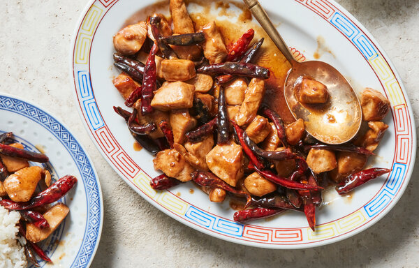 - Combine the oil and chiles in a wok or large nonstick skillet, and set over medium heat. When the chiles start to sizzle and brown, about 15 seconds, push them to one side of the pan. Add the chicken to the other side all at once and spread in a single, even layer. Cook, without moving the pieces, until the bottoms are dark golden brown, 3 to 5 minutes. If the chiles start to blacken, put them on top of the chicken so that they don’t burn.