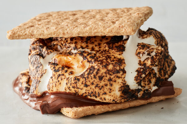 - Immediately place the charred, skewered marshmallows, on the chocolate-topped cracker. Take the unadorned cracker and press down as you pull out the skewer so that the gooey marshmallows ooze over the chocolate and peak out of the edges of the crackers. Devour immediately. Repeat, repeat, repeat.