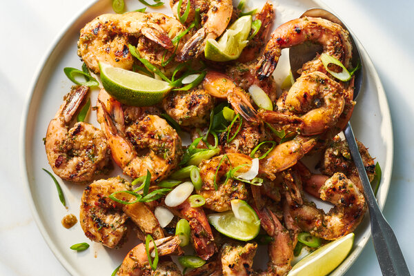 - Working in batches, grill shrimp directly on the grill grates until nicely charred and just cooked through, about 2 minutes per side. Transfer to a serving platter, garnish with the sliced scallions and serve with lime wedges.