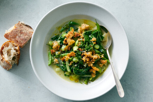 - Divide vegetable mixture among bowls and top with the toasted bread crumbs, a drizzle of olive oil and a grind of black pepper. Serve with crusty bread, for soaking up the broth.