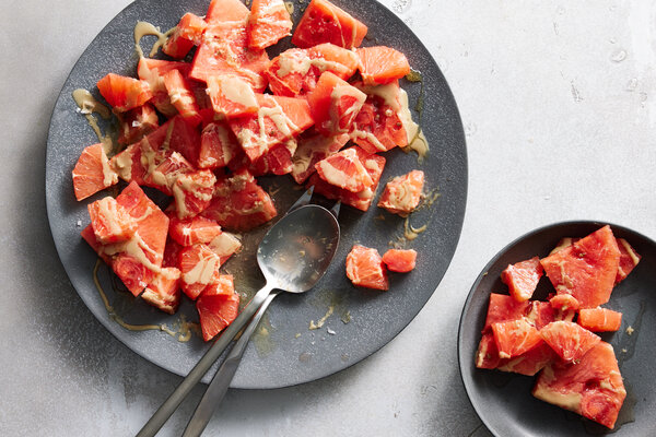 - Drizzle the tahini over the fruit, followed by the honey. Sprinkle with salt. Taste. If it’s bitter, add more honey. If it’s dull, add more salt and honey. Eat right away.