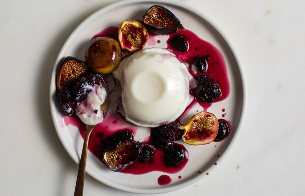- Heat oven to 400 degrees. Make the compote: In a small, wide skillet, a gratin dish, or a pie pan, arrange the berries, then the figs cut-side-up. Sprinkle with the granulated sugar and the kirsch or Calvados. Roast, uncovered until juicy, with most of the liquid evaporated, about 40 minutes. Let cool to room temperature.