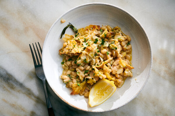 - Add the white beans and the wine. Let it simmer until the liquid evaporates and the beans are soft, about 5 minutes, then mash the beans with a potato masher or a fork. Make them as smooth or lumpy as you like. You just want to release some of their starch. Turn off the heat.
