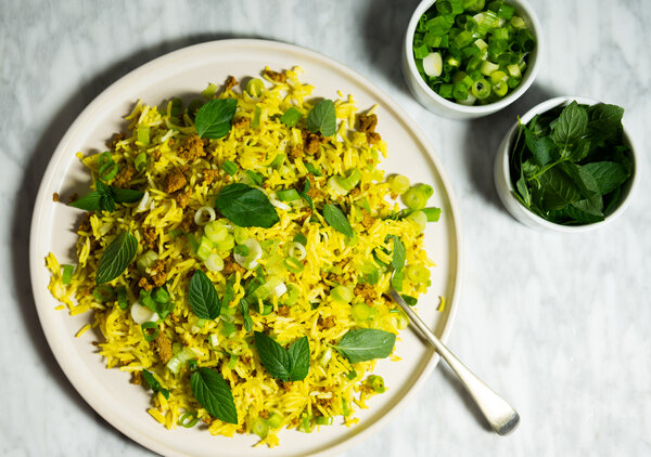 - Stir the rice into the cooked lamb mixture, then drizzle with the remaining 1 tablespoon lime juice. Fold the scallions and mint into the rice, and serve immediately.