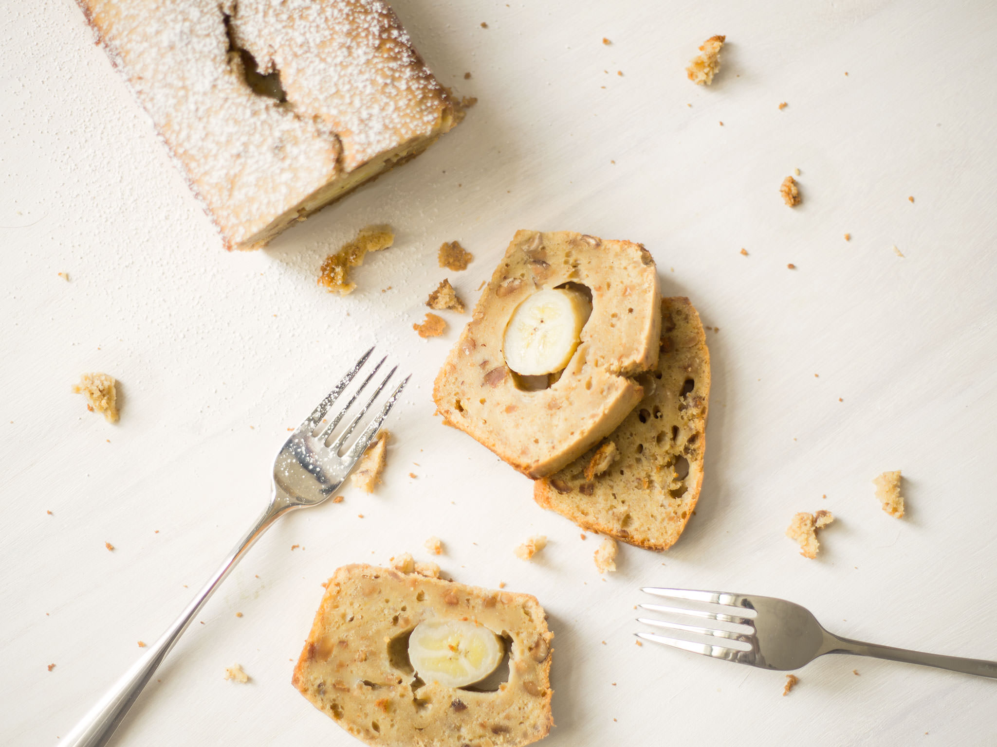 If needed, grease baking dish. Pour in half of batter. Peel remaining banana and place it on top of the batter. Cover with remaining batter. Transfer to oven and bake in preheated oven at 180°C / 350°F until an inserted toothpick comes out clean, approx. 40 – 50 min. Allow to cool, then sprinkle with confectioners’ sugar. Enjoy with whipped cream or with homemade hazelnut spread.