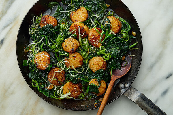 Soy-Butter Basted Scallops With Wilted Greens and Sesame