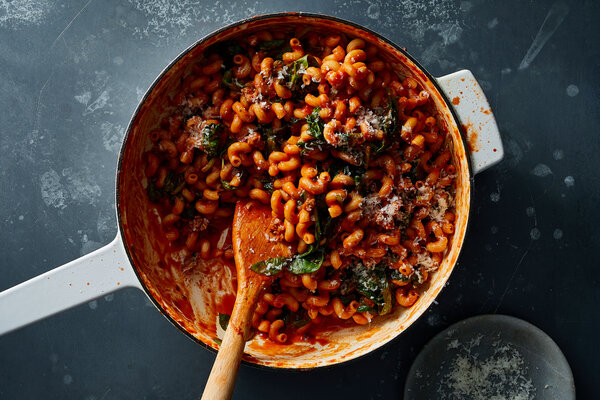 4. Add the pasta, coating it with the liquid. (It won’t be fully submerged, and that’s OK.) Adjust the heat to maintain an active simmer with small bubbles forming on the surface. Cover and let cook, stirring every few minutes to make sure nothing is sticking at the bottom of the pan, until the pasta is al dente, about 1 minute less than the package instructions. If the pasta is still hard at this point, add a few tablespoons of warm water at a time and cook until just al dente. Depending on your pasta size and shape, you may need to add several tablespoons of water.