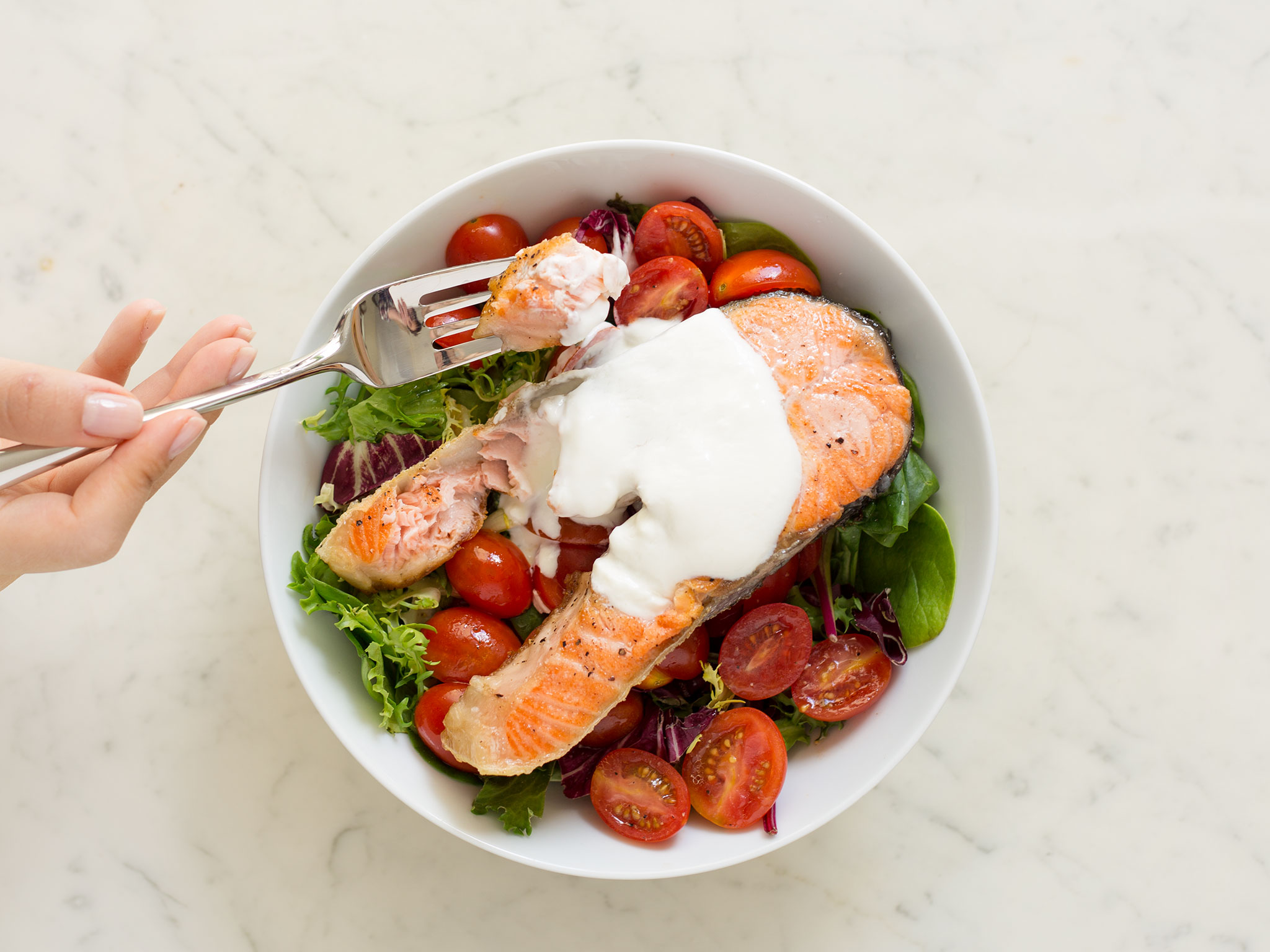 Mix together tomatoes and baby leaf lettuce and transfer to a bowl for serving. Place salmon steak on top of salad. Top everything off with some yogurt and enjoy!