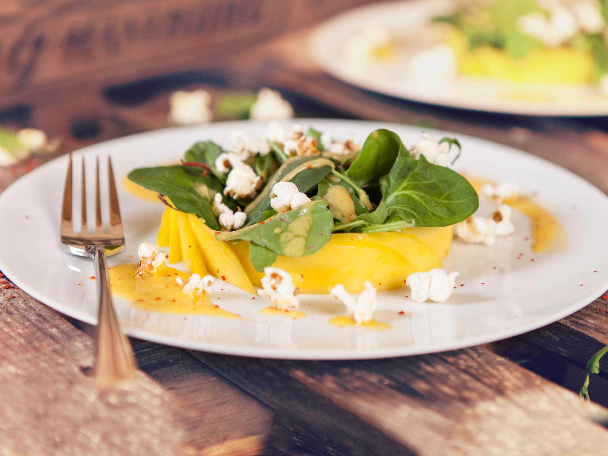 Place the salad on the four plates, drizzle with the dressing, and finally add the toasted pine nuts and spicy popcorn on top.