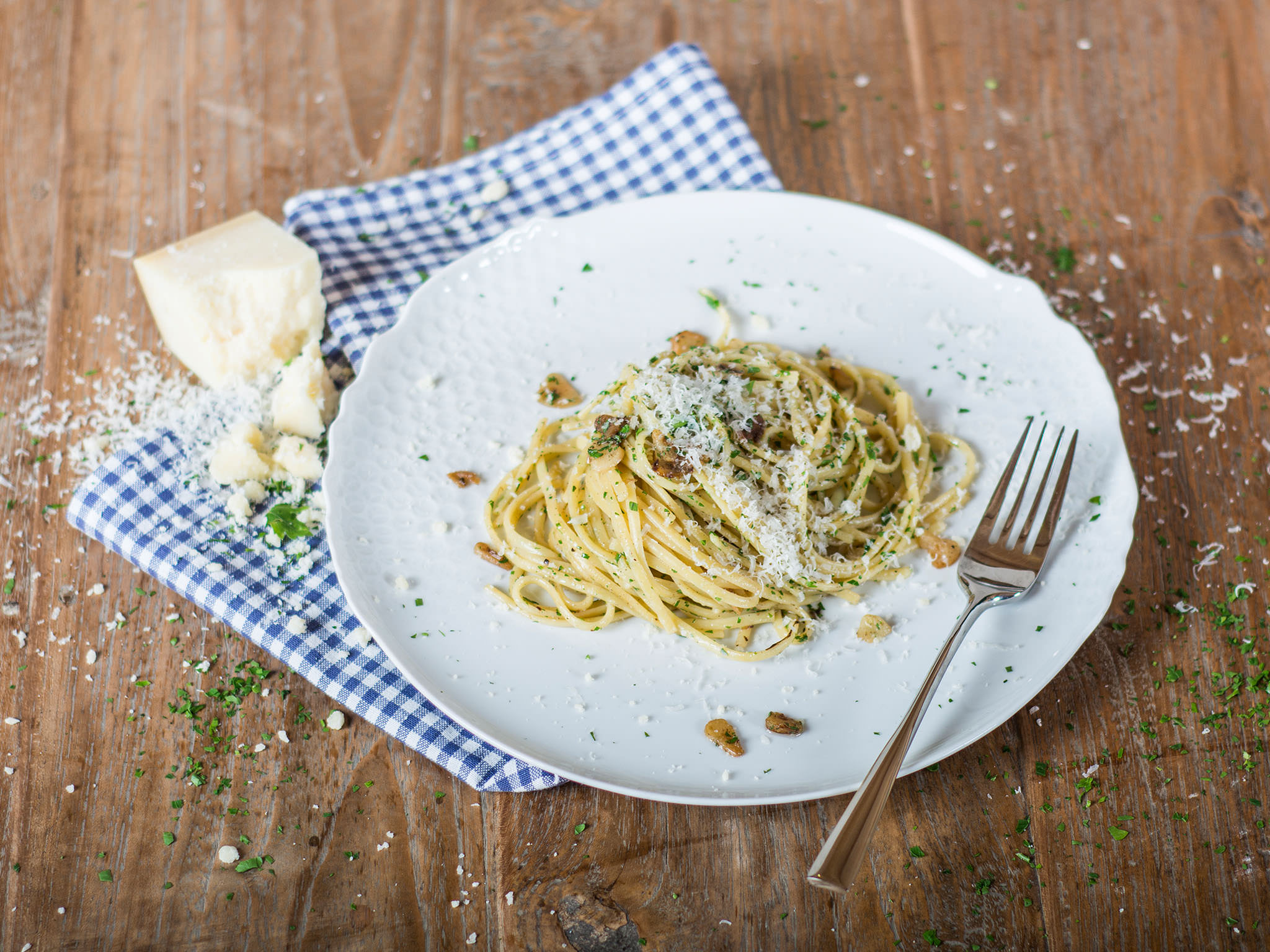 Add cooked pasta to the pan and toss in garlic oil. Fold in chopped parsley and season with salt and pepper. Serve sprinkled with freshly grated Parmesan cheese to taste.