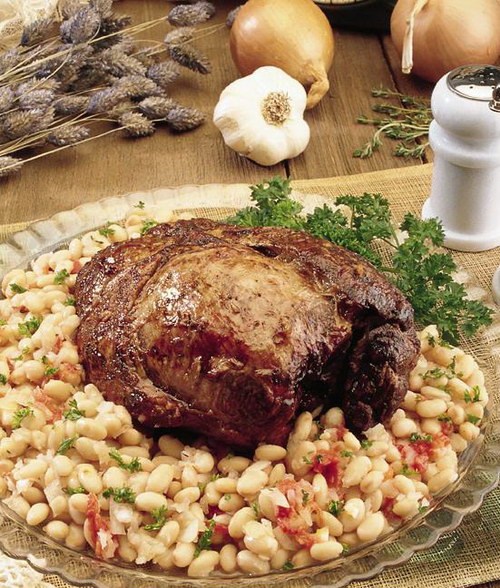 Lamb and beans the French way. To most Americans, accustomed to pork with their beans, lamb with white beans is an unusual combination. But it’s an everyday meal to the French, particularly those from Brittany. The beans are cooked until tender, combined with garlic, onion, herbs and plum tomatoes, and then cooked again for several hours with the lamb. We like our roast lamb fairly well done, while the French prefer it pink. A meat thermometer is a great help in roasting it to just the right degree.