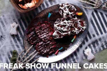 Bring the carnival home this Halloween season with these freak show-inspired “blood red” and “cobweb” funnel cakes. Finish them off…