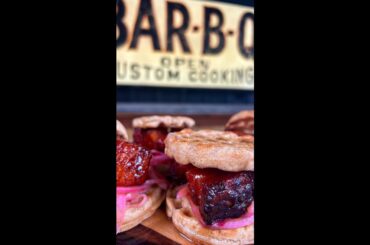 @meat.therapy Smoked Maple Bourbon Pork Belly Burnt End Waffle Sliders (heart eye emoji) Talk about a delicious mouthful with @meat.therapy…